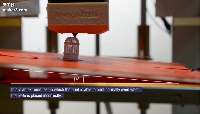 除此之外,BAU擠出機被設計成易于拆卸,以便于進行快速和簡單的維修。除此之外,這款3D打印機還有一個特性,即在開始打印時,安裝在BAU上的傳感器會感應打印床的四個角,以確定其水平度和進行相應調整。而且即使打印床明顯傾斜,它們也能正常的打印。(他們展示了一個在14度傾斜的打印床上獲得的良好3D打印結果)。