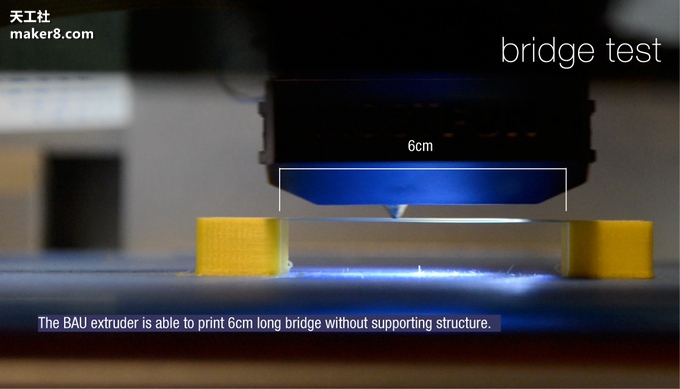 “擠出機是我們在開發過程中花時間最多的一個部件。”墨之坊公司稱,“它不僅可實現高精度打印,而且可以打印跨度為5厘米的橋(無支撐哦)。”