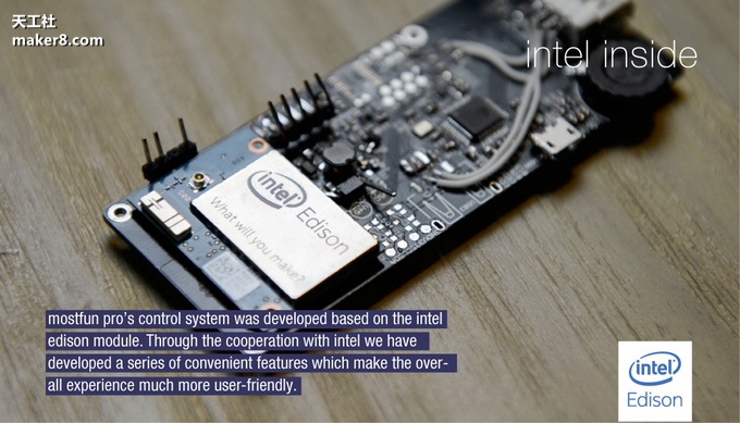 當然,mostfun Pro最吸引眼球的地方還在于他們使用了英特爾Edison模塊。據墨之坊團隊稱,使用Edison芯片的好處在于,用戶一開始不需要安裝任何進一步的3D打印機驅動或軟件。它的使用也可以在一個對等(peer-to-peer)網或本地網絡上共享。